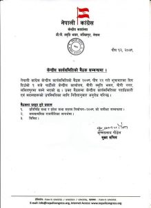 नेपाली काङ्ग्रेसले केन्द्रिय समिति बैठक डाक्यो