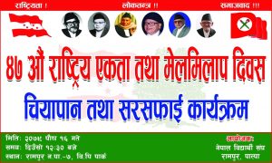 नेपाल विद्यार्थी संघ रामपुर नगरले ४७ औं राष्ट्रिय एकता र मेलमिलाप दिवस कार्यक्रम गरि मनाउने भएको छ ।