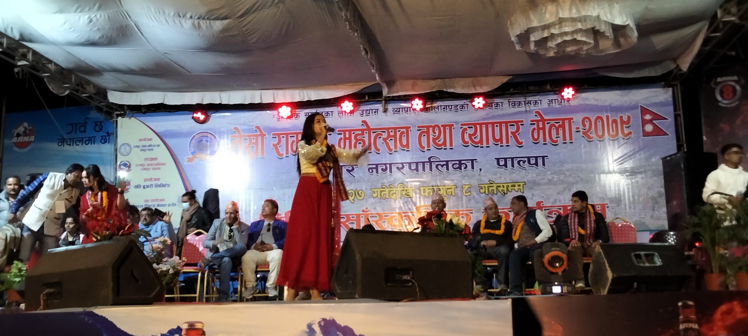 पाल्पाली गायिका शान्ती डोेटेलको प्रस्तुति पनि मंगलबार नै थियो । लोकगीत र लोकदोहोरीमा पोख्त डोटेलले ‘पैला नम्बर सुन’ गीतबाट गायन शुरु गर्नुभयो । रामपुरको माटोमा जन्मिएकी हुर्किएकी शान्तीले ‘रुदै छु म रामपुर फाटैमा, अबभेट मसानघाटैमा..’ चोली गुनियो खैके हुने हो’ रोइला गीत ‘फर्किदैन उमेर’ लगायतका गीत गाउनुभयो । कार्यक्रममा लोकदोहोरी गायक कुशल वेल्वासेको पनि बेजोड प्रस्तुति रहेको थियो । वेलवासेले ‘सनिसार’,‘हातैका पैजाले’, ‘रानीफूल बसायो’ ‘रातो घलेकीमा’लगायतका गीतबाट दर्शकलाई मनोरञ्जन दिनुभएको थियो ।
