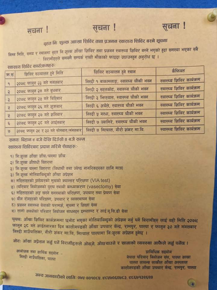 गाउँपालिकाको आयोजना, नेपाल परिवार नियोजन संघ, पाल्पा शाखा, पाल्पा लायन्स लाकौल आँखा अस्पताल तानसेन र कालीगण्डकी आँखा तथा कान उपचार केन्द्र रामपुरको प्राविधिक सहयोगमा चल्ने शिविर प्रत्येक वडा स्वास्थ्य चौकीबाट प्रदान गरिने निस्दी गाउँपालिकाका स्वास्थ्य शाखा प्रमुख रेम बहादुर दिशाले जानकारी दिनुभयो ।