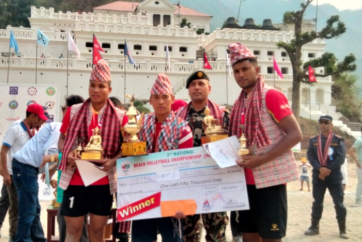 पाल्पाको रानीमहलमा संचालित राष्ट्रिय पुरुष बिच भलिबल प्रतियोगिताको उपाधि त्रिभुवन आर्मी क्लबले जितेको छ ।