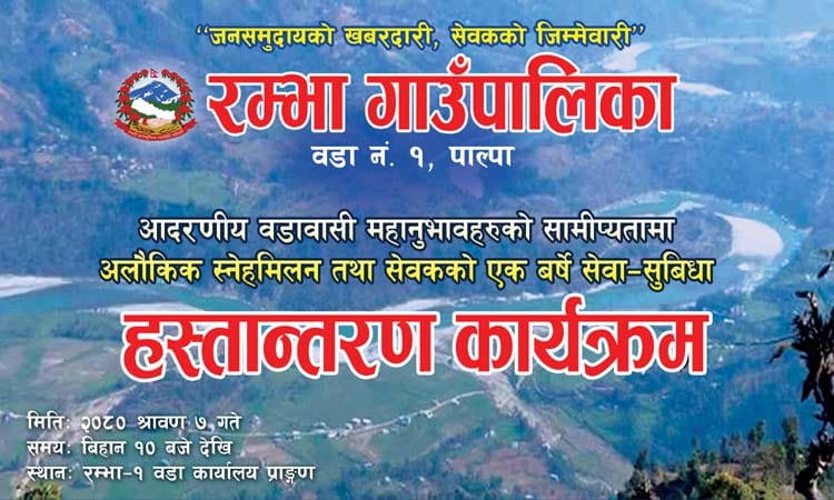 शासकको रुपमा नभई नागरिकको सेवामा सेवकको रुपमा उभिने रम्भा गाउँपालिका १ का वडाध्यक्षले आर्थिक बर्ष सकिएसँगै जनतासँग स्नेहमिलन तथा समिक्षा र सुझाबको लागि कार्यक्रमको आयोजना गर्नुभएको छ ।
