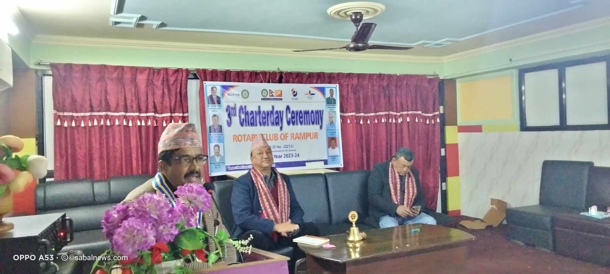 पाल्पाको रामपुरमा स्थापना भएको सामाजिक संस्था रोटरी क्लब रामपुरले स्थापनाको तेस्रो बर्ष पुगेको अबसरमा चाटर्ड डे मनाएको छ ।