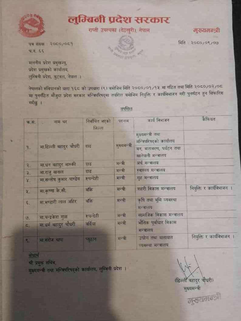 लुम्बिनी प्रदेश सरकारमा आइबार दुई मन्त्री थपिने निश्चित भएको छ ।