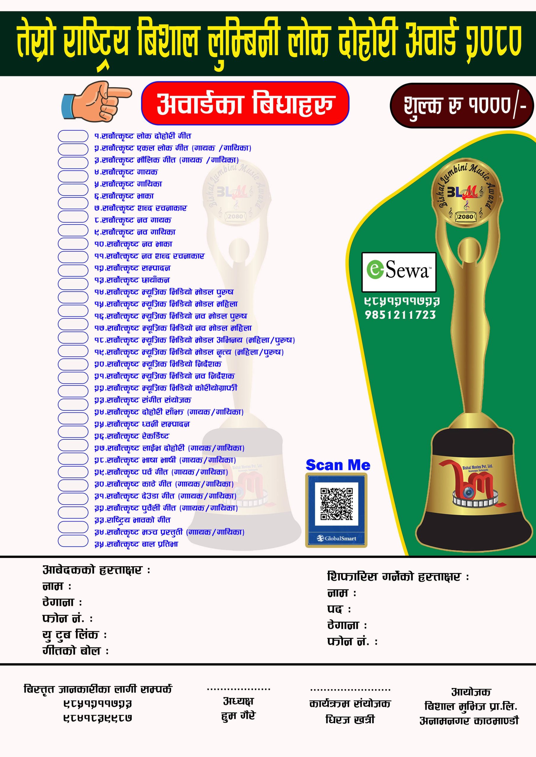 “तेस्रो राष्ट्रिय बिशाल लुम्बिनी लोक दोहोरी अवार्ड” २०८० को आवेदन फाराम खुल्ला