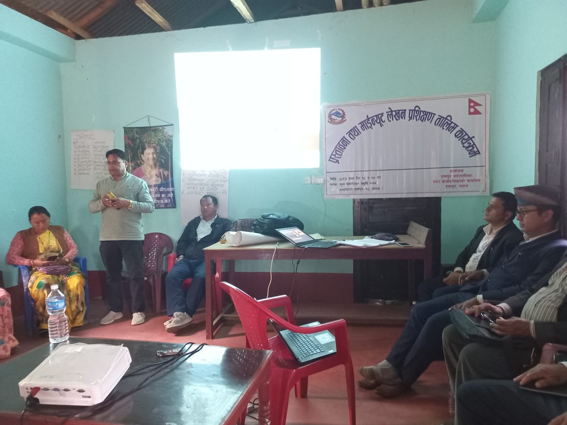 रामपुर नगरपालिका वडा नम्बर १० का वडा अध्यक्ष तोयानाथ सारु थापाको अध्यक्षतामा भएको तालिममा बोल्दै अध्यक्ष सारुले नगर र वडाका हरेक योजना कार्यक्रमबारे अति आबश्यक ज्ञानसीप सम्बन्धी जानकारी तालिममा दिएको बताउदै आउदा दिनमा तालिममा सिकेका बिषयलाई ध्यान दिएर काम गर्न सहभागीलाई आग्रह गर्नुभयो ।