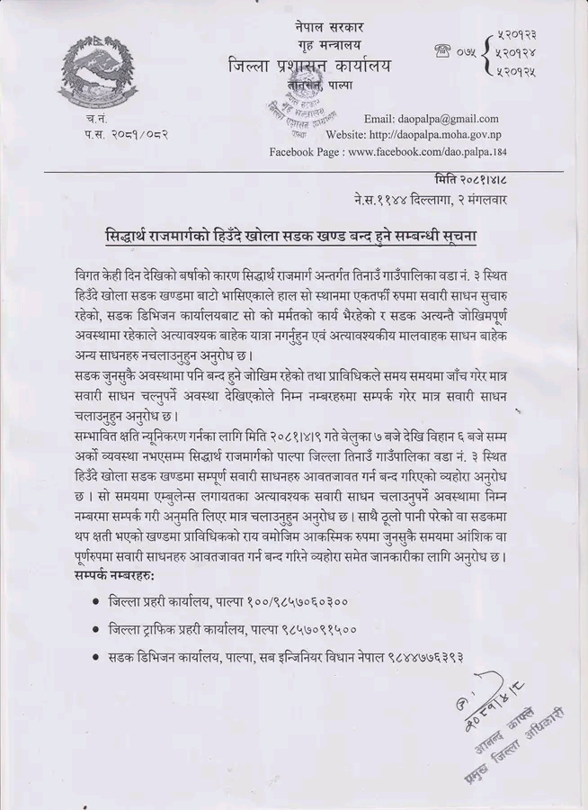 सम्भावित क्षति न्यूनिकरण गर्नका लागि मिति २०८१।४।९ गते वेलुका ७ बजे देखि विहान ६ बजे सम्म अर्को व्यवस्था नभएसम्म सिद्धार्थ राजमार्गको पाल्पा जिल्ला तिनाउँ गाउँपालिका वडा नं. ३ स्थित हिउँदे खोला सडक खण्डमा सम्पूर्ण सवारी साधनहरु आवतजावत गर्न बन्द गरिएको व्यहोरा अनुरोध छ ।