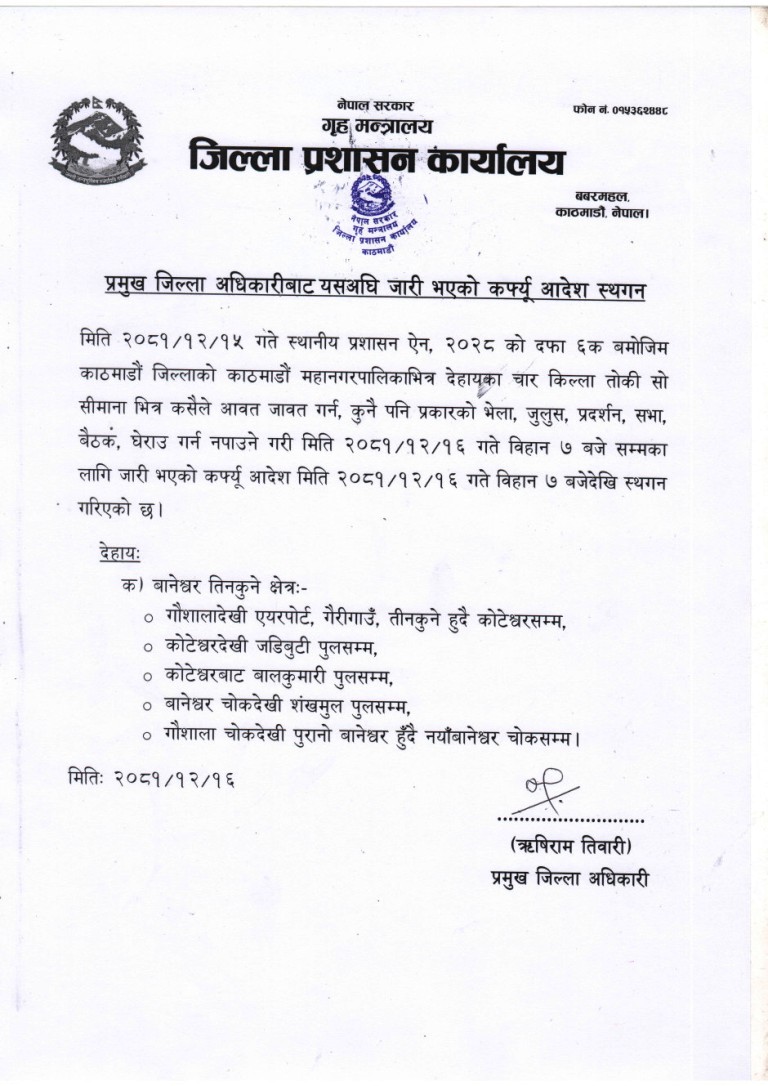 काठमाडौंका प्रमुख जिल्ला अधिकारी ऋषिराम तिवारीले सूचना सार्वजनिक गर्दै कर्फ्यू स्थगन भएको जानकारी गराएका हुन् ।
