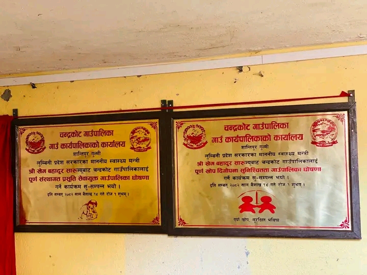 लुम्बिनी प्रदेशका माननीय स्वास्थ्यमन्त्री खेम बहादुर सारुले गुल्मीको चन्द्रकोट गाउँपालिकालाई पुर्ण संस्थागत प्रसुति पालिका एवम पुर्ण खोप दिगोपना पालिका घोषणा गर्नुभएको छ ।