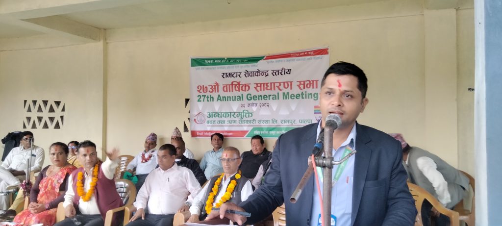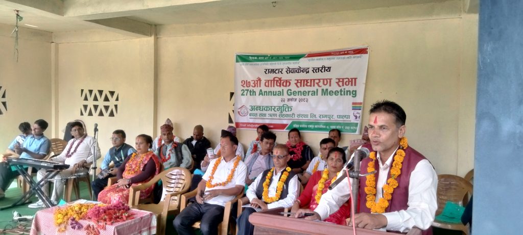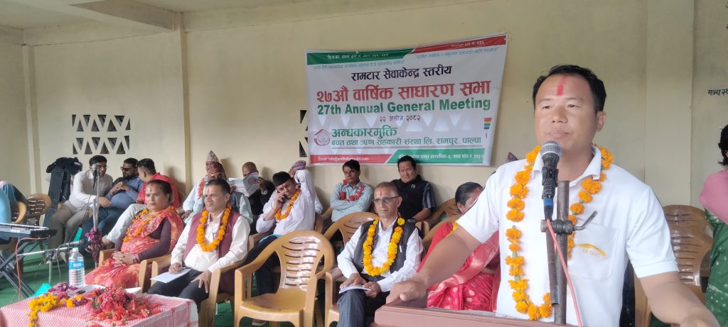 अन्धकार मुक्ति बचत तथा ऋण सहकारी सस्थाको  २७ औं साधारण सभाको लागि सेवा केन्द्र स्तरीय ४ वटै सेवा केन्द्र स्थानमा एकैसाथ सुझाव संकलन सहितको साधारण सभा भएको छ । रामपुर ७ डुम्रीगाउँमा केन्द्रिय कार्यालय रहेको सहकारीले  रामपुर नगरपालिका–९ अर्भसिं, रामपुर नगरपालिका–१० रामटार, रम्भा गाउँपालिका–५ ताँहु, र निस्दी गाउँपालिका–५ ढुङ्गानावेशीमा सेवाकेन्द्र स्तरीय निणर्य प्रमाणितसहित प्रतिनिधिमुलक सभा गरेको हो।