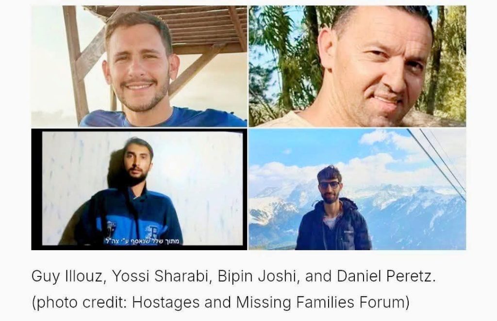 एक विज्ञप्ति जारी गर्दै हमासको सशस्त्र शाख कसम ब्रिगेड्सले मृतक बन्दीहरू गाय इलुज, योसी शाराबी, बिपिन जोशी र ड्यानियल पेरेजको रूपमा पहिचान गरेको हो । अल-कसम ब्रिगेड्सले आज (सोमबार) चार इजरायली बन्दीका शव हस्तान्तरण गर्ने घोषणा गरेको छ ।